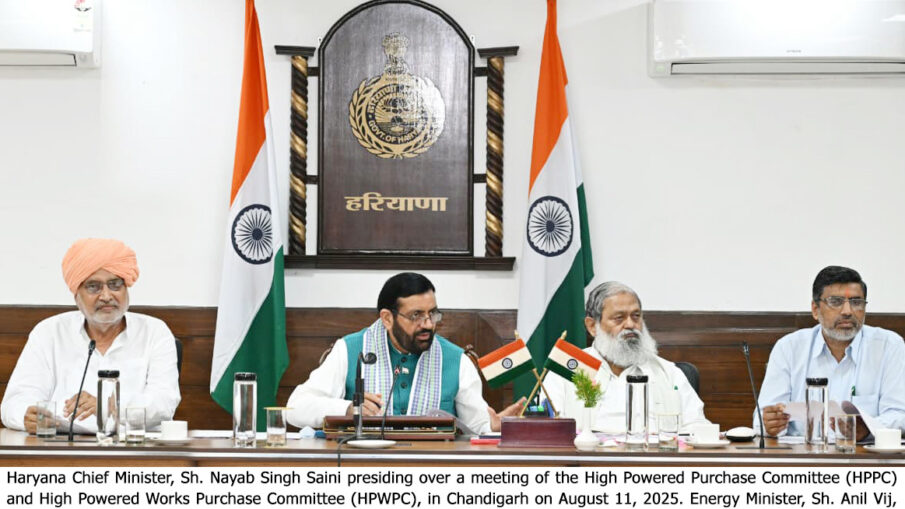 Haryana Chief Minister, Sh. Nayab Singh Saini presiding over a meeting of the High Powered Purchase Committee (HPPC) and High Powered Works Purchase Committee (HPWPC), in Chandigarh on August 11, 2025. Energy Minister, Sh. Anil Vij, Education Minister, Sh. Mahipal Dhanda, Agriculture and Farmers’ Welfare Minister, Sh. Shyam Singh Rana, Public Health Engineering, Sh. Ranbir Gangwa and Women and Child Development Minister, Smt. Shruti Choudhry are also seen in the picture.