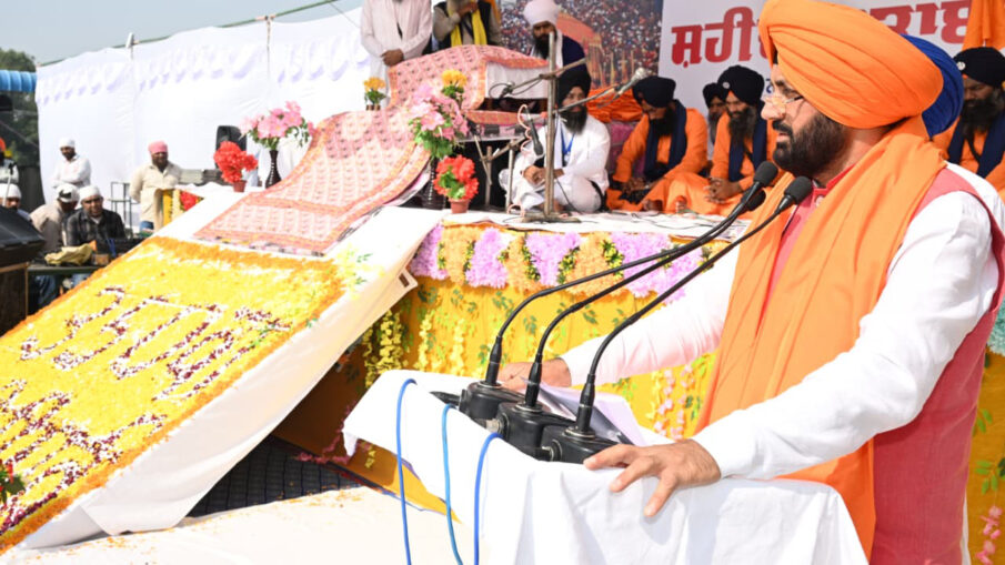 Haryana Chief Minister, Sh. Nayab Singh Saini addressing the gathering during the Shahidi Yatra programme dedicated to the 350th martyrdom year of Sri Guru Tegh Bahadur Ji, organised at Gurudwara Sahib, Rori, Sirsa district, on November 8, 2025.