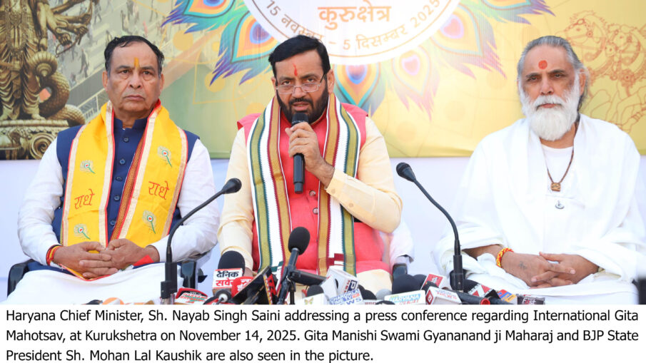 Haryana Chief Minister, Sh. Nayab Singh Saini addressing a press conference regarding International Gita Mahotsav, at Kurukshetra on November 14, 2025. Gita Manishi Swami Gyananand ji Maharaj and BJP State President Sh. Mohan Lal Kaushik are also seen in the picture.