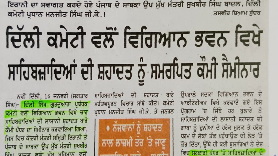 ਪ੍ਰੋ. ਸਰਚਾਂਦ ਸਿੰਘ ਖਿਆਲਾ ਨੇ ਕਿਹਾ ਕਿ 16 ਜਨਵਰੀ 2018 ਨੂੰ ਦਿੱਲੀ ਸਿੱਖ ਗੁਰਦੁਆਰਾ ਮੈਨੇਜਮੈਂਟ ਕਮੇਟੀ ਵੱਲੋਂ ਦਿੱਲੀ ਦੇ ਵਿਗਿਆਨ ਭਵਨ ਵਿੱਚ ਸਾਹਿਬਜ਼ਾਦਿਆਂ ਦੀ ਅਲੌਕਿਕ ਸ਼ਹਾਦਤ ਨੂੰ ਸਮਰਪਿਤ ਇੱਕ ਕੌਮੀ ਸੈਮੀਨਾਰ ਆਯੋਜਿਤ ਕੀਤਾ ਗਿਆ ਸੀ। ਉਸ ਸਮੇਂ ਸਰਦਾਰ ਮਨਜੀਤ ਸਿੰਘ ਜੀ.ਕੇ. ਦਿੱਲੀ ਕਮੇਟੀ ਦੇ ਪ੍ਰਧਾਨ ਸਨ ਅਤੇ ਇਸ ਸੈਮੀਨਾਰ ਵਿੱਚ ਸ਼੍ਰੋਮਣੀ ਅਕਾਲੀ ਦਲ ਦੇ ਪ੍ਰਧਾਨ ਅਤੇ ਤਤਕਾਲੀ ਉਪ ਮੁੱਖ ਮੰਤਰੀ ਪੰਜਾਬ ਸਰਦਾਰ ਸੁਖਬੀਰ ਸਿੰਘ ਬਾਦਲ ਅਤੇ ਕੇਂਦਰੀ ਮੰਤਰੀ ਸ੍ਰੀਮਤੀ ਸਿਮਰਤੀ ਇਰਾਨੀ ਮੁੱਖ ਮਹਿਮਾਨ ਵਜੋਂ ਸ਼ਾਮਿਲ ਹੋਏ ਸਨ।