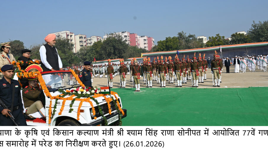 ਹਰਿਆਣਾ ਦੇ ਖੇਤੀਬਾੜੀ ਅਤੇ ਕਿਸਾਨ ਭਲਾਈ ਮੰਤਰੀ ਸ਼੍ਰੀ ਸ਼ਿਆਮ ਸਿੰਘ ਰਾਣਾ ਸੋਨੀਪਤ ਵਿੱਚ ਆਯੋਜਿਤ 77ਵੇਂ ਗਣਤੰਤਰ ਦਿਵਸ ਸਮਾਰੋਹ ਵਿੱਚ ਪਰੇਡ ਦਾ ਨਿਰੀਖਣ ਕਰਦੇ ਹੋਏ । (26.01.2026)